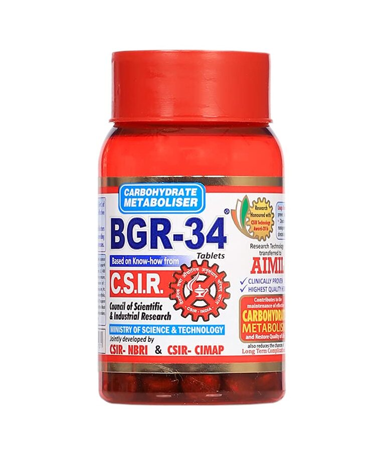 BGR-34 stands for Blood Glucose Regulator – 34, a name that reflects its primary purpose. It is a proprietary polyherbal formulation developed by AIMIL Pharmaceuticals in collaboration with the Council of Scientific and Industrial Research (CSIR) and the National Botanical Research Institute (NBRI), India.