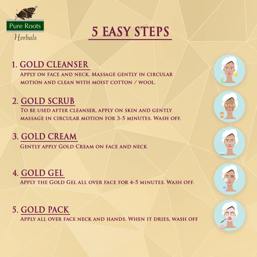 Pure Roots Herbals Gold Facial Kit is designed for both men and women who seek nourished and radiant skin. Infused with gold dust, this facial kit for men and women instantly brightens the skin, giving it a youthful and radiant glow. Whether you have dull and damaged skin, this gold facial kit for men and women offers a salon-like glow with 5 easy steps you can do at home.